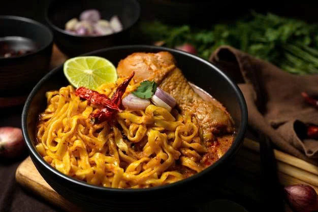 Khao Soi is a signature dish of Northern Thailand, especially popular in Chiang Mai. This rich and comforting curry noodle soup combines soft egg noodles in a fragrant coconut curry broth, topped with crispy fried noodles for extra texture. It’s usually served with chicken or beef and comes with side garnishes like pickled mustard greens, shallots, lime, and chili oil to adjust the flavor to your taste. Creamy, spicy, and aromatic, Khao Soi is a must-try dish that reflects the unique culinary traditions of Northern Thailand.