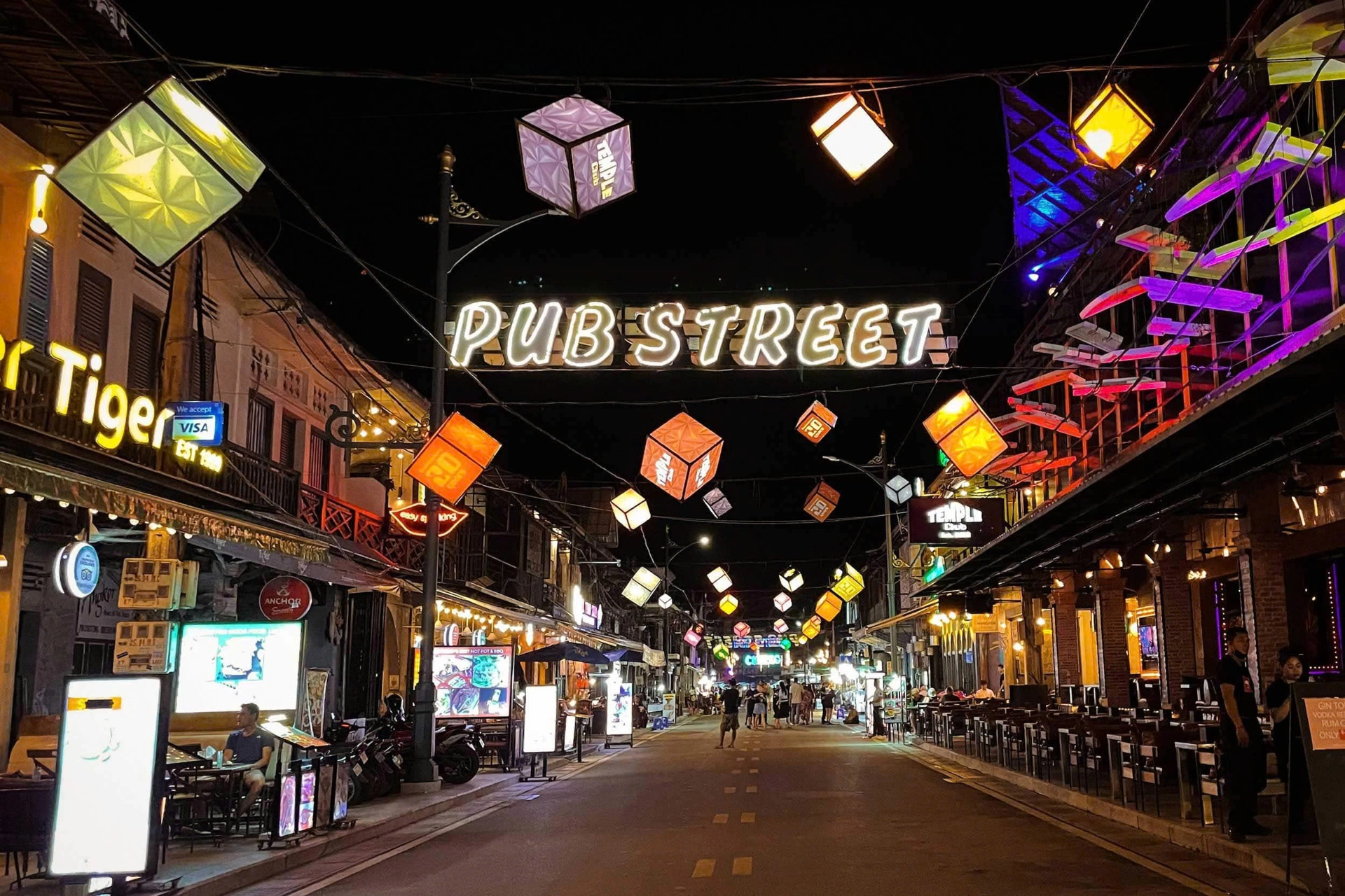 End your day at lively Pub Street, where colorful lights, buzzing bars, and tasty Cambodian street food make for a fun evening.